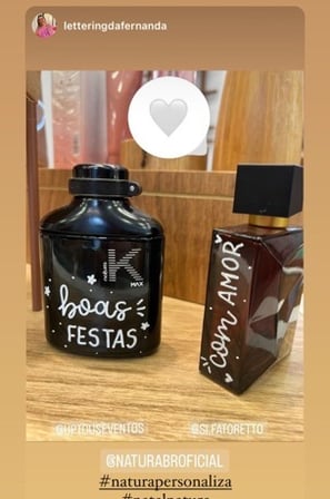 Simultaneamente, coordenamos uma grande campanha nacional em 45 lojas Natura em 16 estados, onde profissionais de lettering personalizaram frascos e embalagens de produtos Natura para presentes.